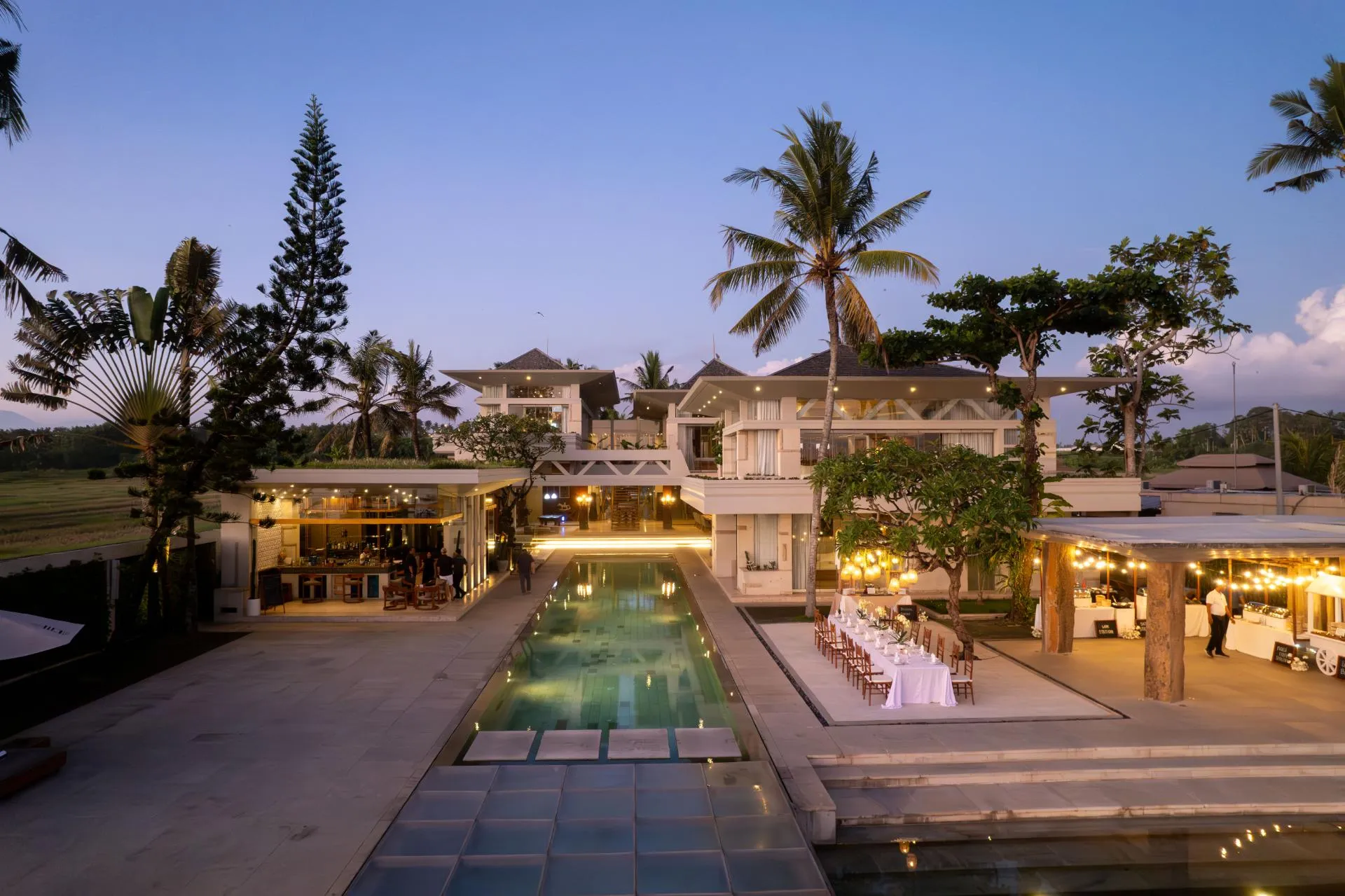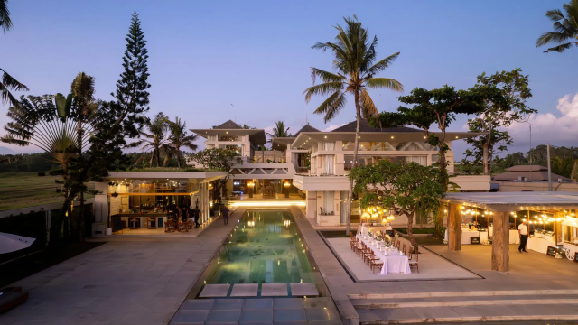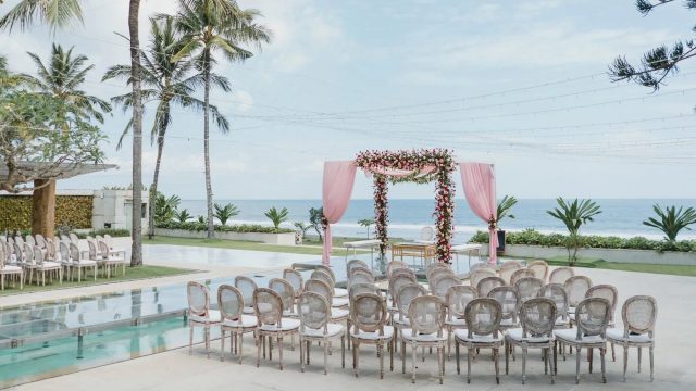 Villa Vedas Bali ini mempunyai vibe yang menarik yaitu pernikahan di tepi pantai yang mewah dengan arsitektur villa yang super modern dan edgy. Lokasinya dari venue ini di dekat objek wisata Tanah Lot tepatnya di daerah Tabanan, jadi lebih tenang dan jauh dari keramaian Kuta atau Seminyak. Venue ini idealnya untuk kapasitas 100 orang, jadi kalau sobat Bali Top punya daftar tamu yang cukup banyak, Venue ini pilihan yang bagus karena areanya luas dan view nya tidak tertutup. Villa Vedas Bali memiliki beberapa spot yang bisa digunakan untuk wedding ceremony ataupun dinner reception sesuai dengan keinginan dari sobat Bali Top. Jika sobat Bali Top menginginkan Ceremony langsung di Tepi Pantai, sobat Bali Top bisa menggunakan Beachfront area mereka, tetapi jika sobat Bali Top tidak menginginkan wedding di atas pasir pantai tetapi tetap ingin mendapatkan view pantai secara dekat dan jelas, sobat Bali Top bisa menggunakan Beachfront Garden area mereka. Tidak hanya itu, jika sobat Bali Top ingin mendapatkan sensasi berjalan diatas air, venue ini dapat mengabulkan keinginan pengantin dengan menggunakan Floating stage diatas kolam renang mereka.